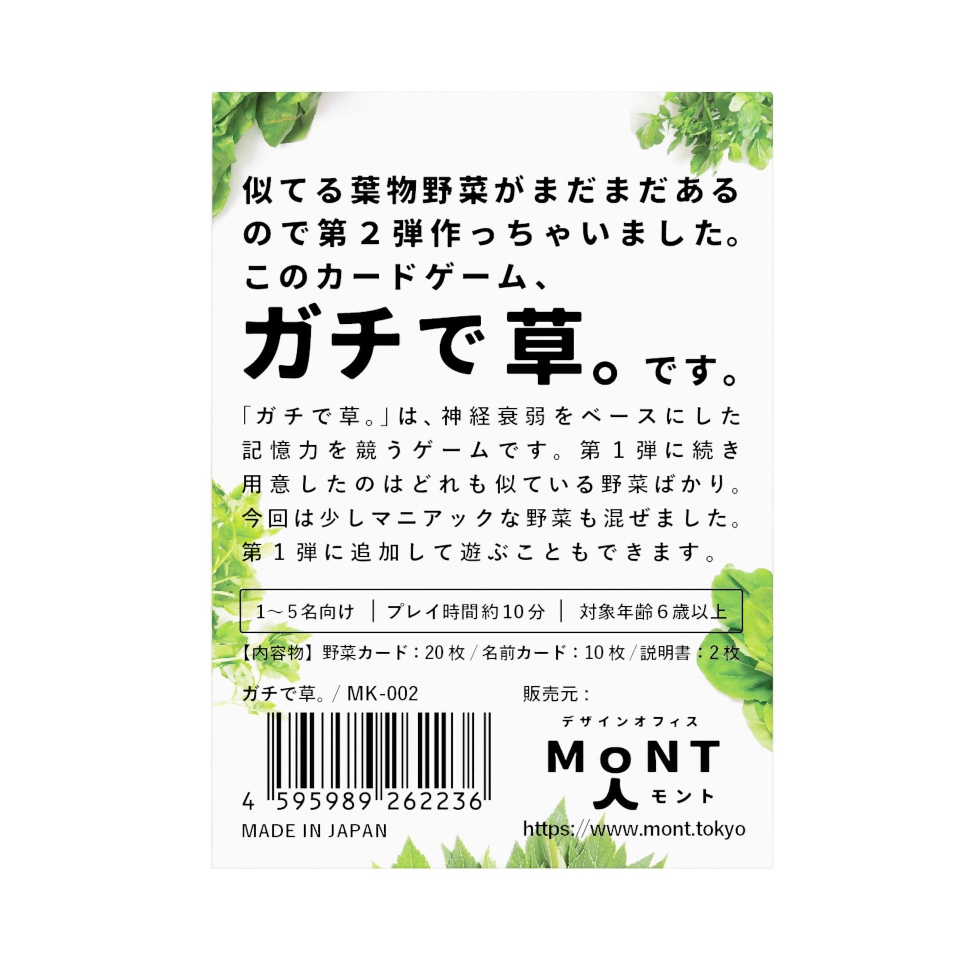 「ガチで草。」は、同じ野菜のカードを揃えたり、野菜の名前を当てたり、記憶力を競って遊ぶカードゲームです。たくさんの野菜カードを“収穫”した方が勝者!!