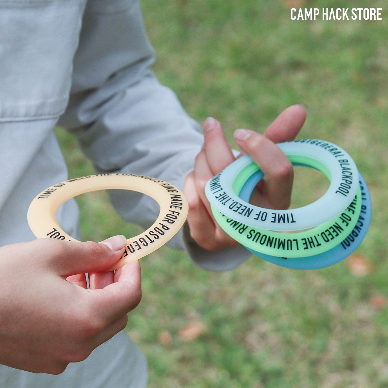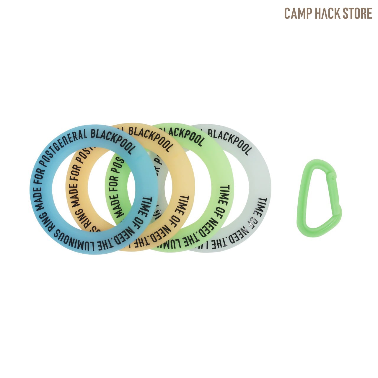 ポストジェネラルの「ルミナスリング パック4」は、蓄光するシリコン製リングが4枚セットになったアイテム。リングを束ねるカラビナまで蓄光仕様ってのがニクイ!