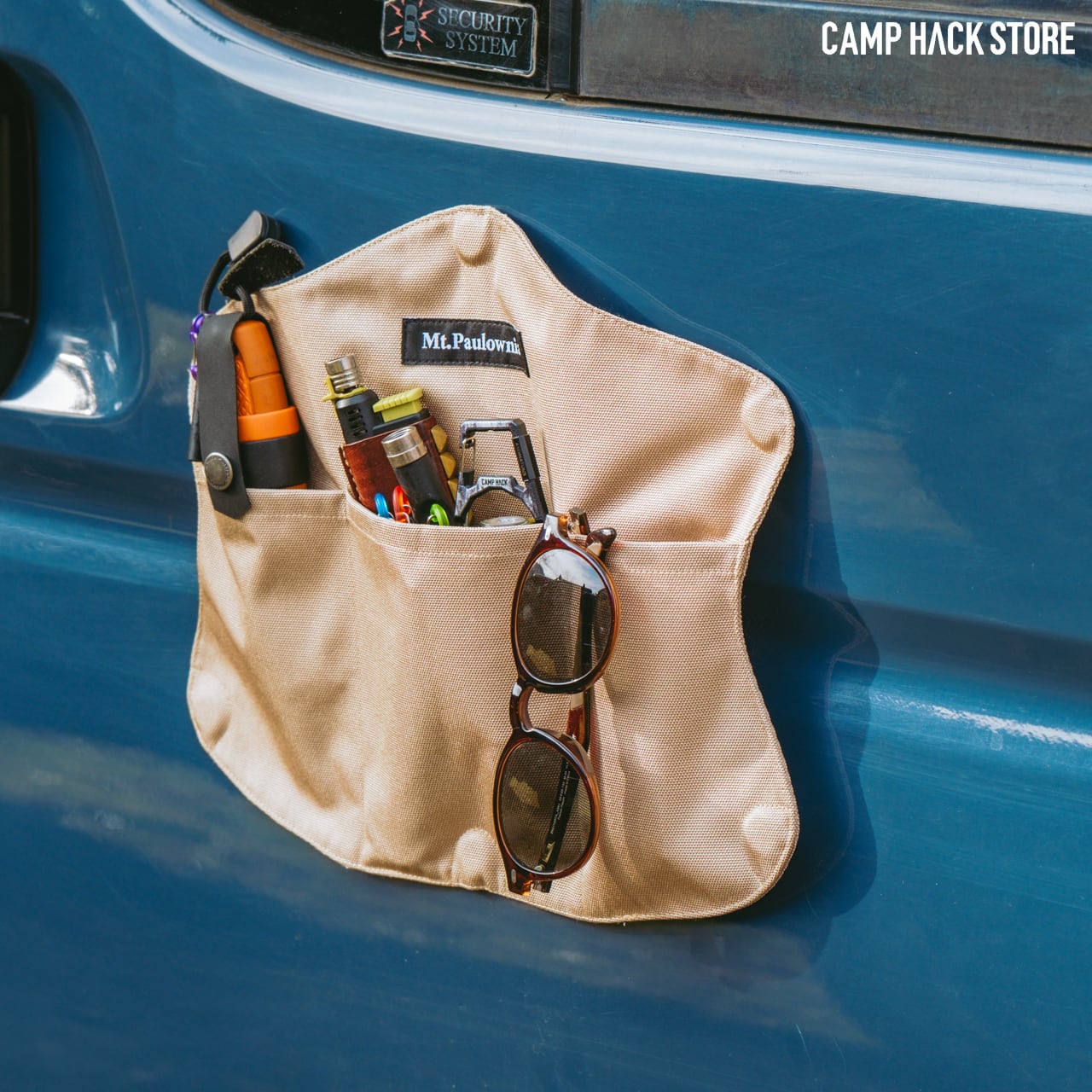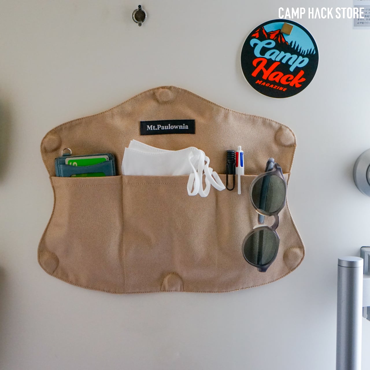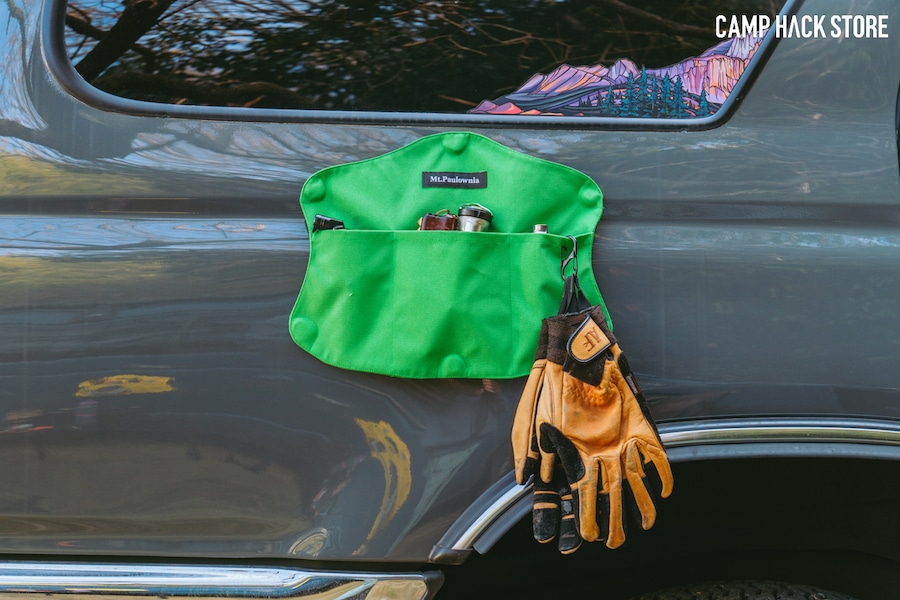車にくっつければ、カトラリーや小物ギアの収納スペースが完成! 座ったままでも手が届く位置に貼ると使い勝手がいいですよ。細かい高さ調整もカンタンです。