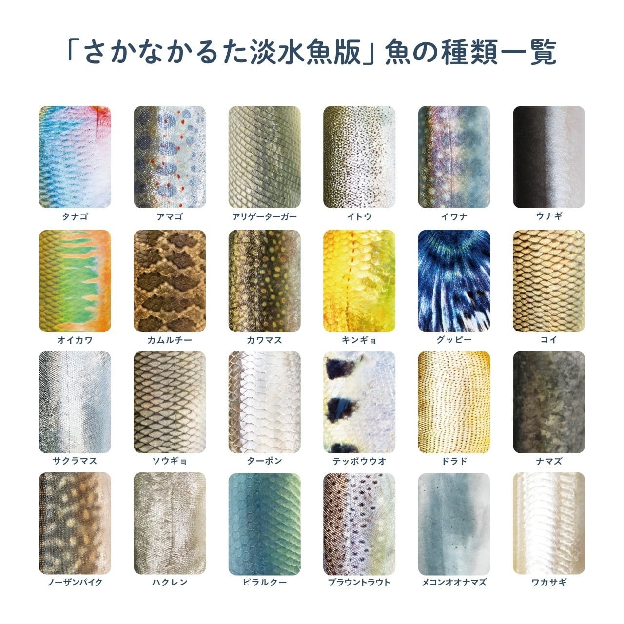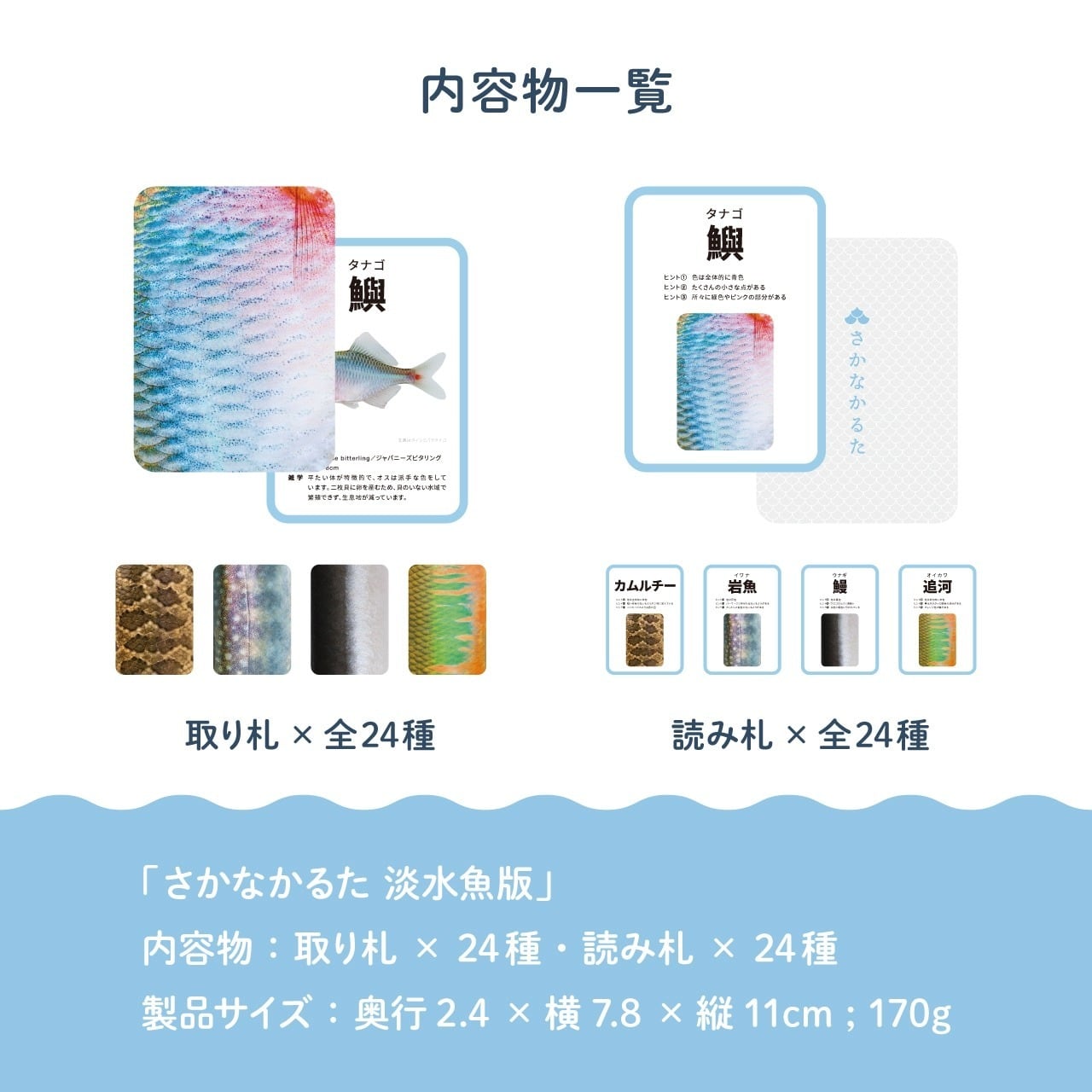 【第1弾】はメジャーな魚種のカードが24種、【第2弾】には淡水魚のカードが24種入っています。