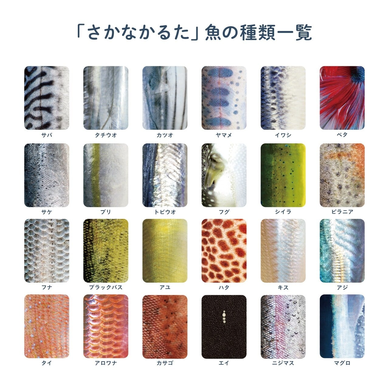 鯖(サバ)/ 太刀魚(タチウオ)/ 鰹(カツオ)/ 山女魚(ヤマメ)/ 鰯(イワシ)/ ベタ/ 鮭(サケ)/ 鰤(ブリ)/ 鱚(キス)/ 鯵(アジ)/ 鯛(タイ)/ アロワナ / 笠子(カサゴ)/ 鱏(エイ)/ 虹鱒(ニジマス)/ 鮪(マグロ)/ 飛魚(トビウオ)/ 河豚(フグ)/ 鱰(シイラ)/ ピラニア/ 鮒(フナ)/ 黒鱒(ブラックバス)/ 鮎(アユ)/ 羽太(ハタ)