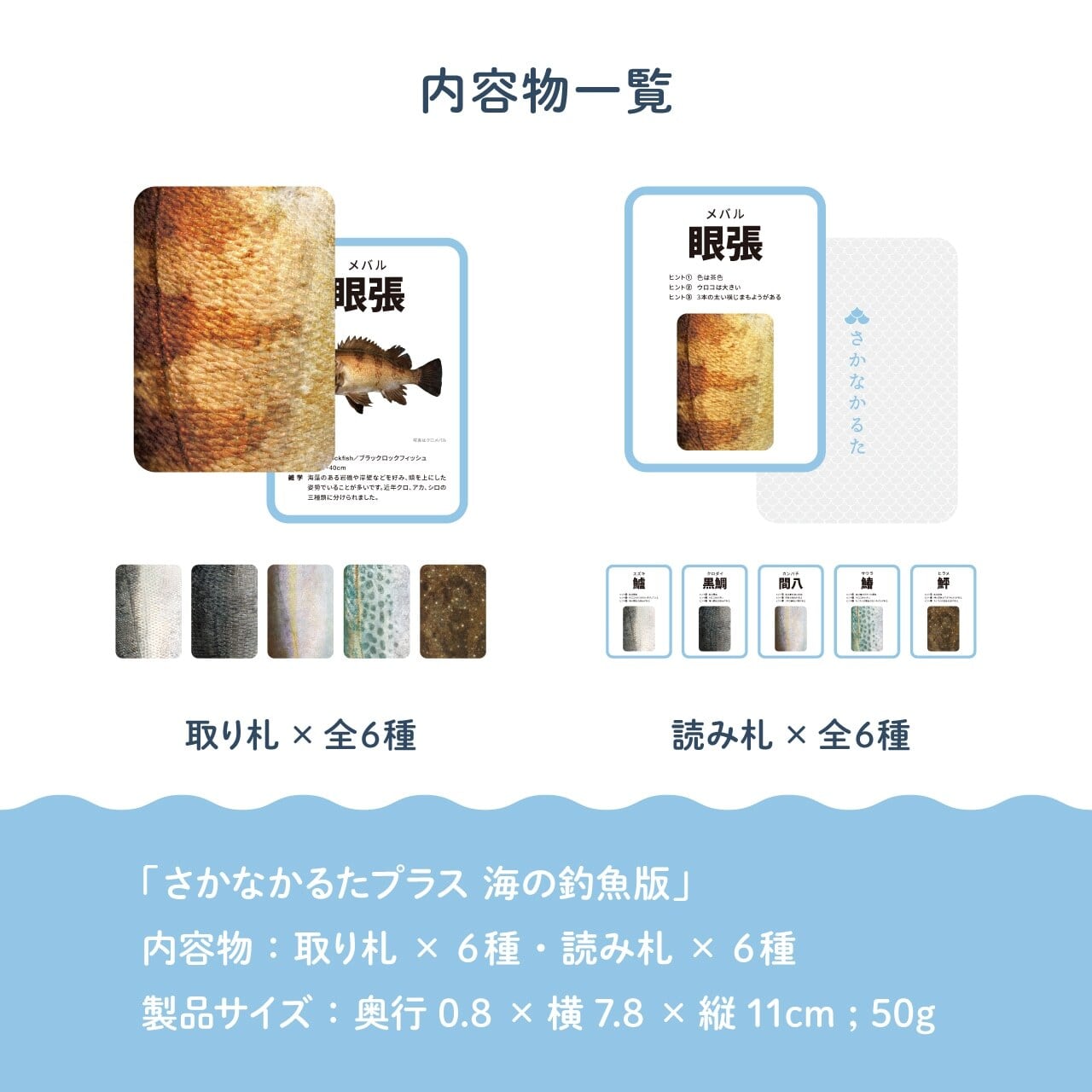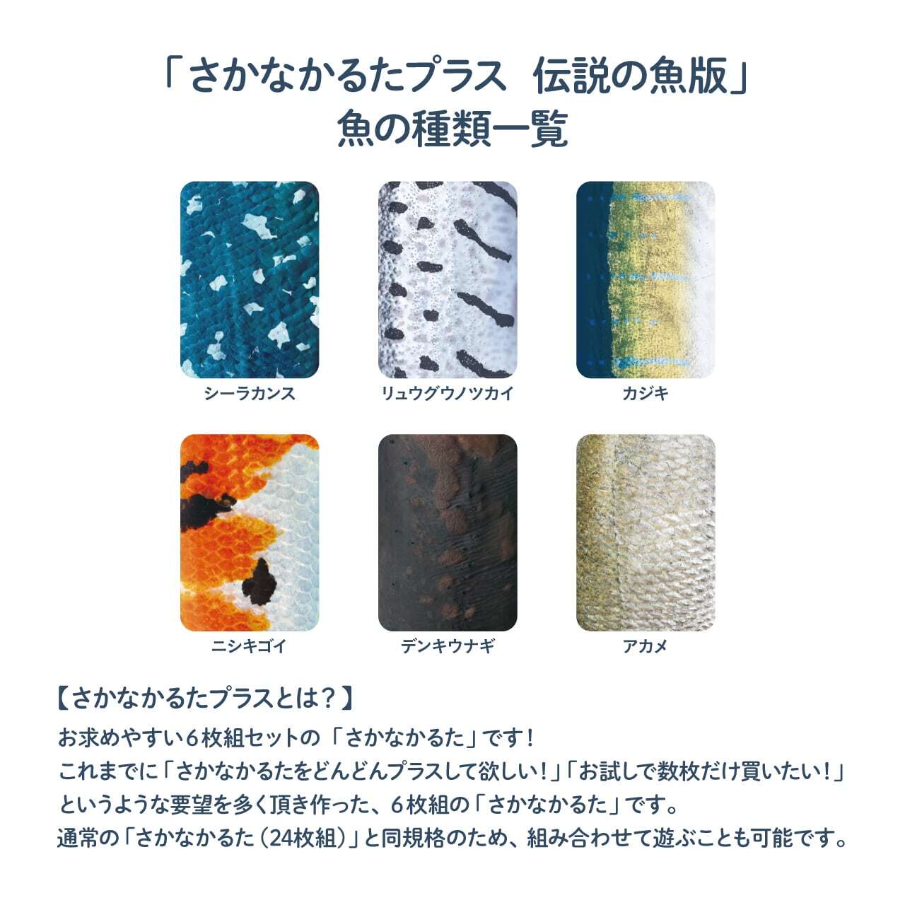 通常版(第1段・第2段)は24枚組なのですが、「さかなかるたプラス」はお持ちのカードに足して遊んでいただける、プラスアルファの6枚組のアイテムです。