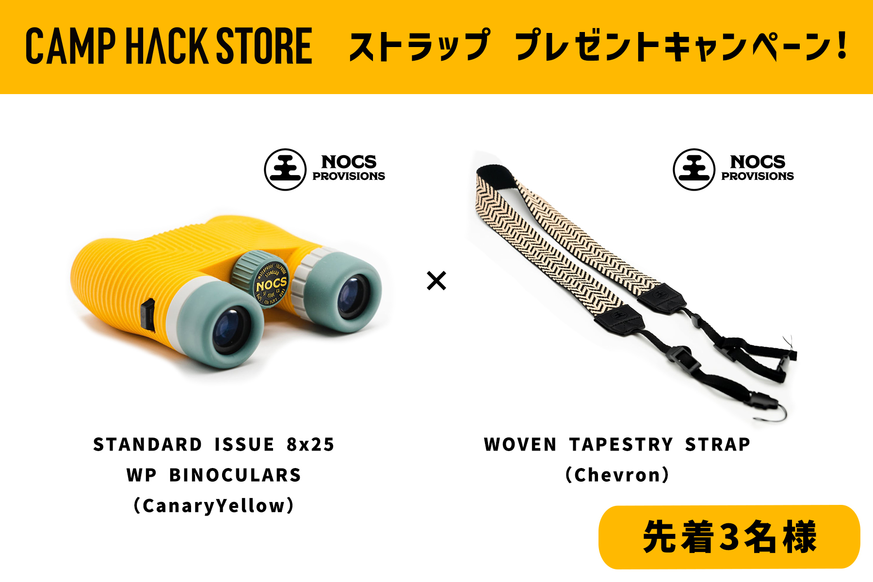 対象の双眼鏡を購入された方にNOCSの「タペストリーストラップ」をプレゼントしちゃいます!キャンペーン期間は2026年3月27日(金曜日)までですが、先着順で無くなり次第終了となりますので、お早めに!対象の双眼鏡とセットで付いてくるストラップは下記をご確認ください。